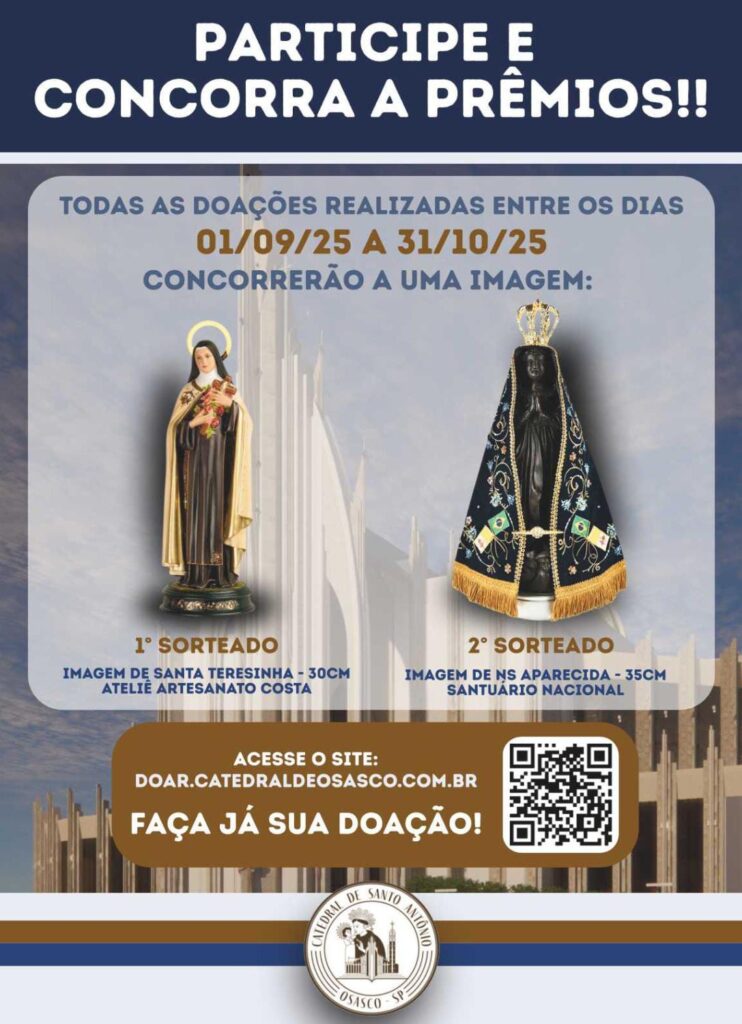 Faça uma doação para ajudar a obra da Igreja Mãe da Diocese de Osasco através da plataforma Doar Digital e concorra ao sorteio, cujo resultado que será divulgado no início do mês de novembro. Para fazer sua doação basta acessar: doar.catedraldeosasco.com.br e fazer seu cadastro e doação. Mas lembre-se: só participará do sorteio as doações que forem feitas através do site Doar!