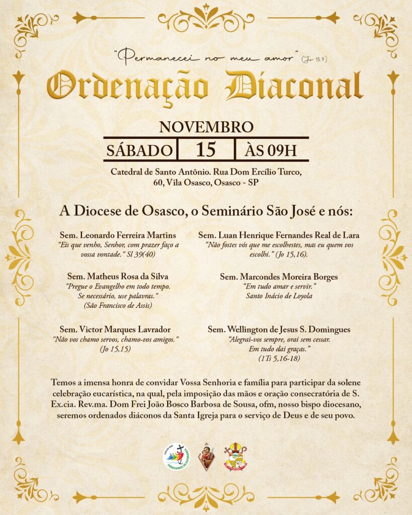 É amanhã! Vamos participar com muita alegria deste momento especial da Diocese de Osasco. Rezemos pelos novos Diáconos de nossa Igreja! Lembrando que não teremos as Santas Missas às 7 e às 12h e também não teremos atendimento de confissões!