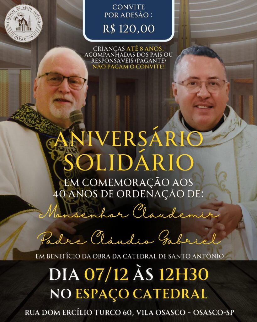 Você já pode adquirir seu convite na Secretaria Paroquial, aberta todos os dias das 8 às 19h30, localizada a Rua Dom Ercílio Turco, 60 – Vila Osasco, ou pela plataforma Sympla pelo link: https://www.sympla.com.br/evento/aniversario-solidario-em-comemoracao-dos-40-anos-de-ordenacao-de-monsenhor-claudemir-e-pe-claudio/3194588