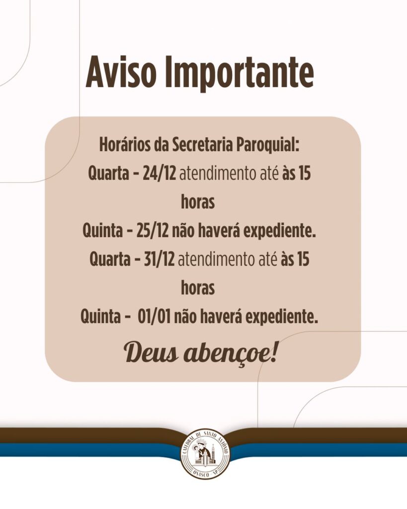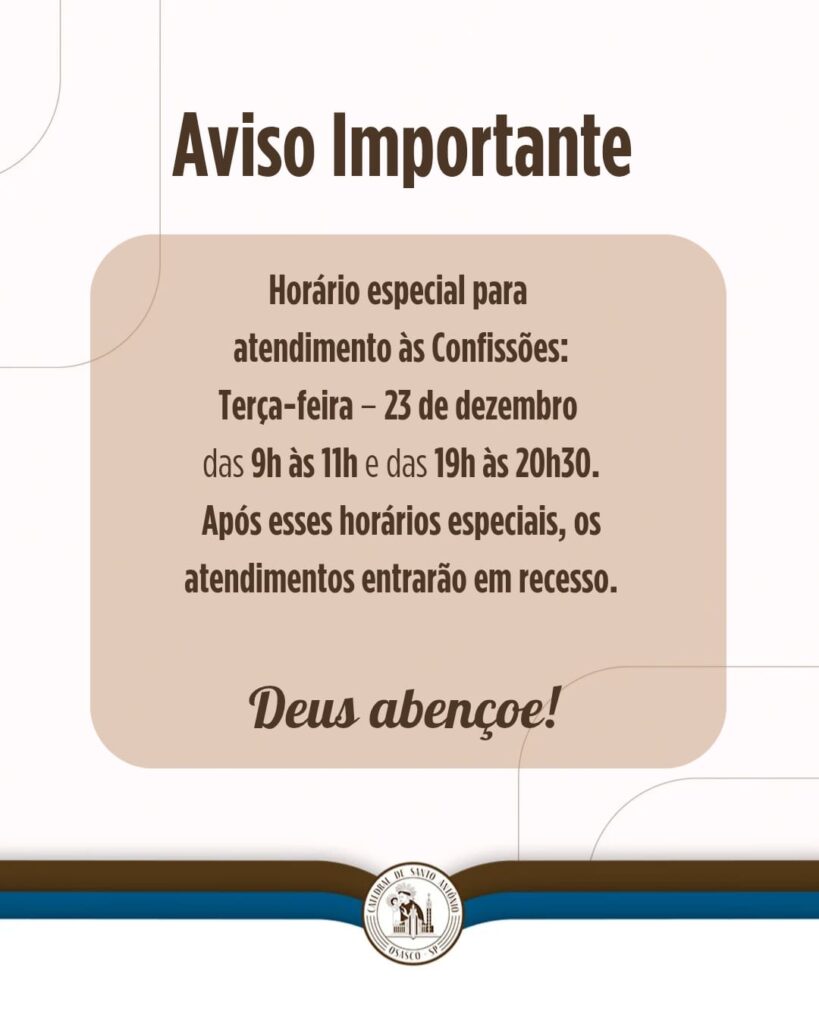 Informamos aos fiéis que, em razão do Natal, os atendimentos de confissões ocorrerão em horários especiais, nesta terça-feira (23): Terça-feira – 23 de dezembroDas 9h às 11hDas 19h às 20h30 Após esses horários especiais, os atendimentos de confissões entrarão em recesso, sendo retomados em data a ser oportunamente comunicada. Pedimos, por caridade e melhor aproveitamento […]